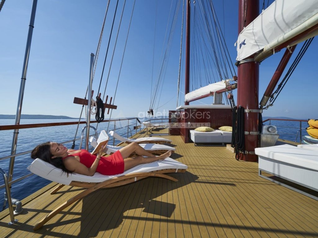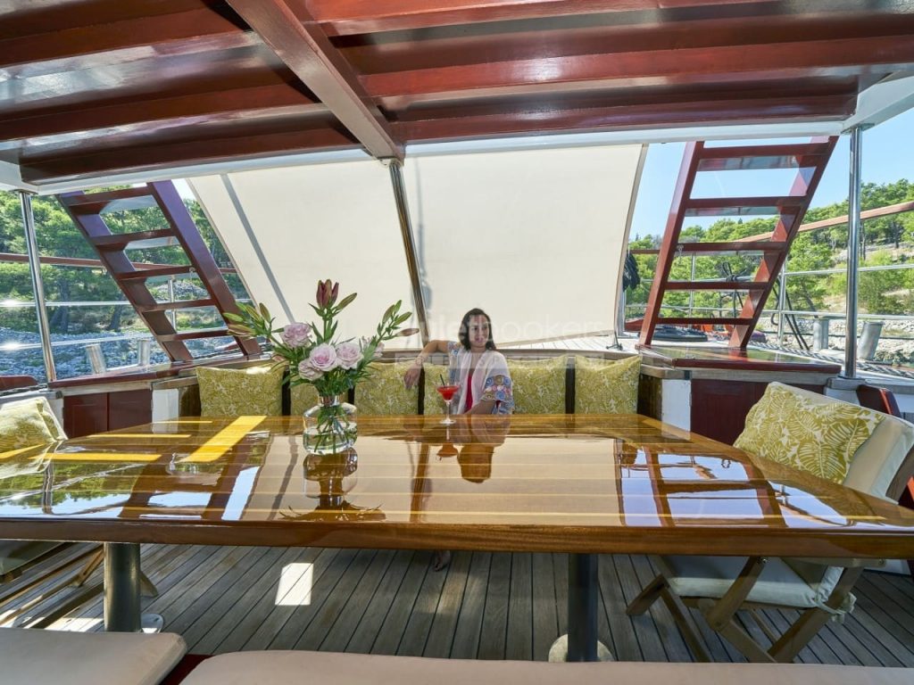 Les espaces extérieurs sont tout aussi invitants, avec un généreux pont ensoleillé orné de matelas et coussins, offrant une retraite parfaite pour bronzer et profiter de vues panoramiques. Le pont arrière, agrémenté d’une table à manger abritée pour 16 personnes, invite les invités à se délecter d’une cuisine méditerranéenne exquise tout en étant entourés de paysages maritimes pittoresques.